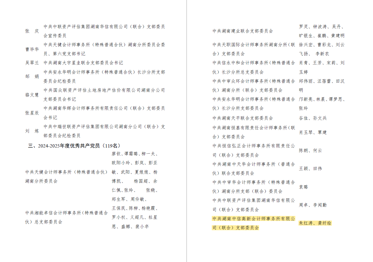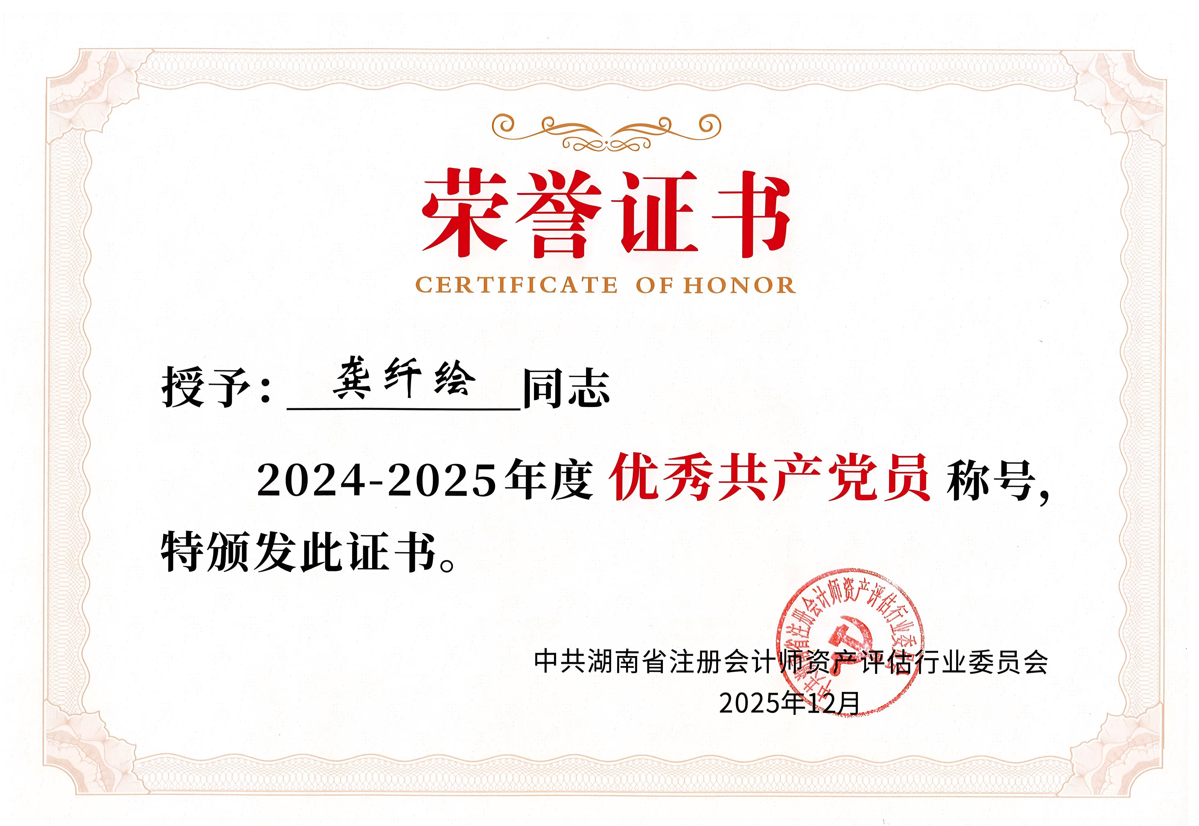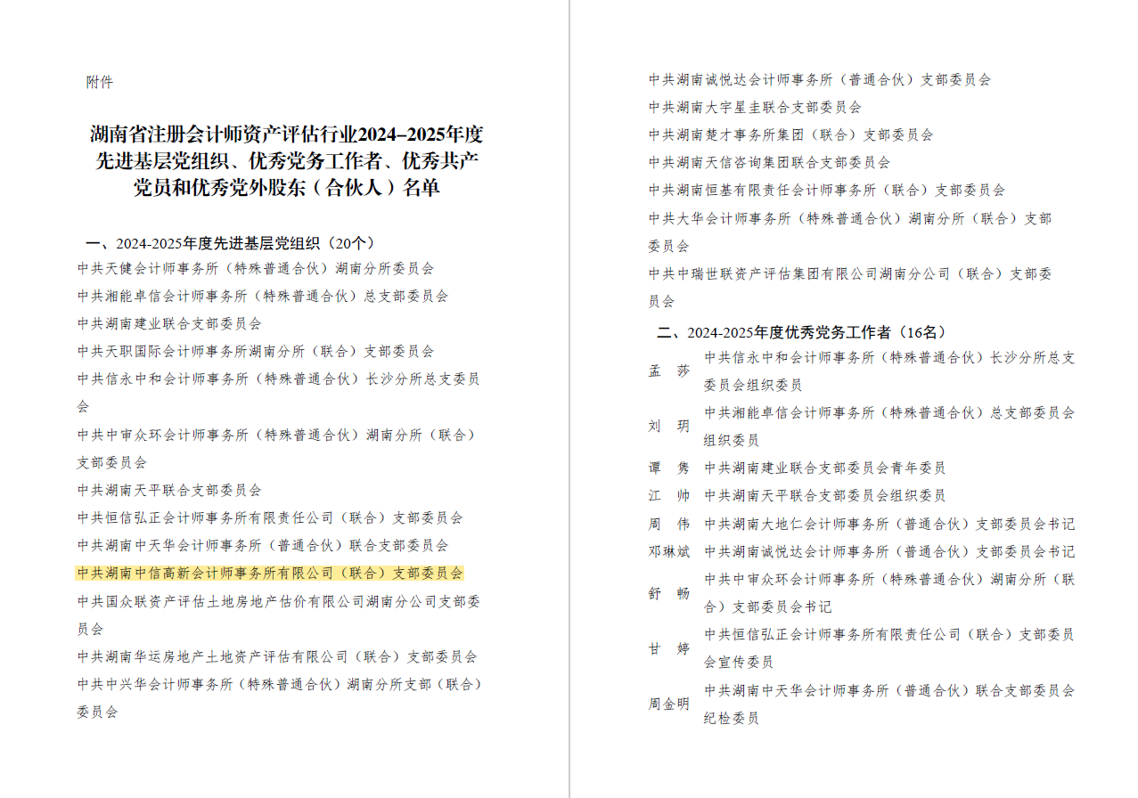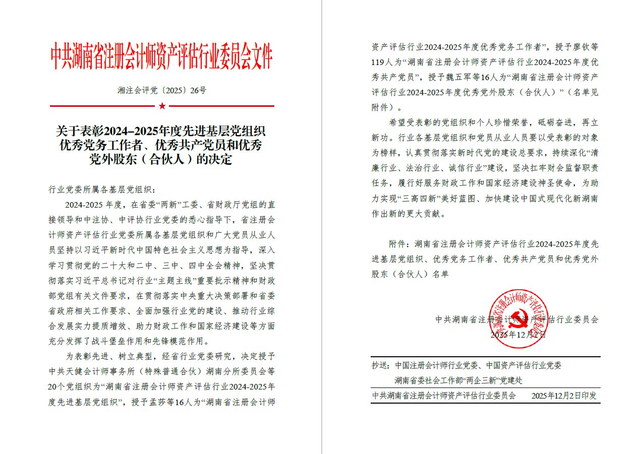 中共湖南中信高新会计师事务所有限公司(联合)支部委员会2024年顺利完成换届,新一届党支部委员会按照省注协行业党委的任务要求开展公司党建工作,结合公司实际,不断探索创新党建工作模式。2024-2025年度评选为优秀基层党组织,这份荣誉,不仅是上级党组织对我们党建工作的肯定与鞭策,更凝聚着全体党员的初心坚守,每一位同志的并肩奋斗。2026-2027年我们以这份荣誉为动力,不骄不躁、再接再厉,持之以恒抓好基层党建工作,让党建工作在企业发展中焕发出独特的魅力和影响力,进一步提升党组织的凝聚力和号召力。