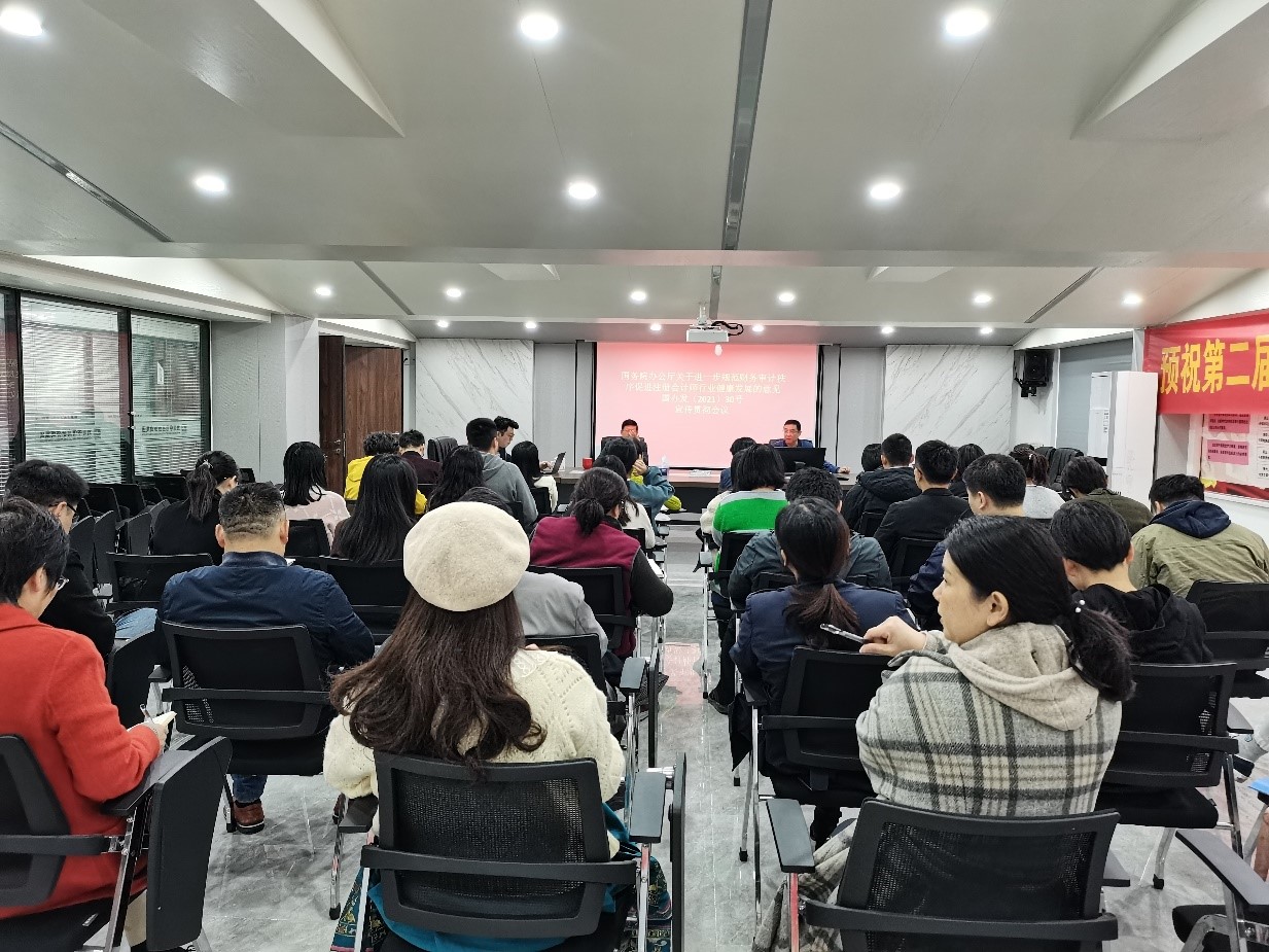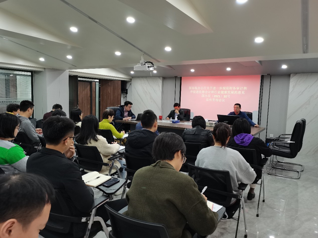 为认真落实注册会计师行业学习宣传《国务院办公厅关于进一步规范财务审计秩序促进注册会计师行业健康发展的意见》(国办发30号)(以下简称《意见》)文件精神,使公司全体员工对《意见》有充分的了解和重视,2021年11月15日上午,湖南中信高新会计师事务所有限公司和公司党支部组织公司全体员工和党员召开“国办发〔2021〕30号”专题学习宣传会。
