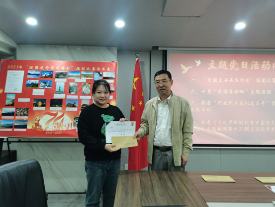 党支部书记朱康同志首先揭晓了“迎国庆为亚运喝彩”摄影比赛活动的获奖名单,并为获奖者颁奖。截止10月13日征稿活动结束,本次活动共征集到31幅(含组照)参赛作品,公司党支部支委会对投稿作品进行了认真细致、客观公正的评选审定,评选出一、二、三等奖和纪念奖若干。优秀作品将推荐参加湖南省建设工程造价管理协会组织的“迎国庆